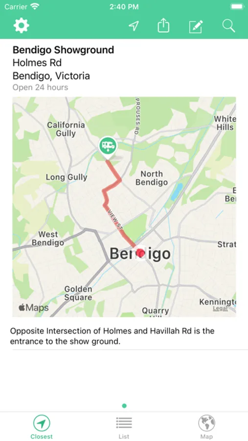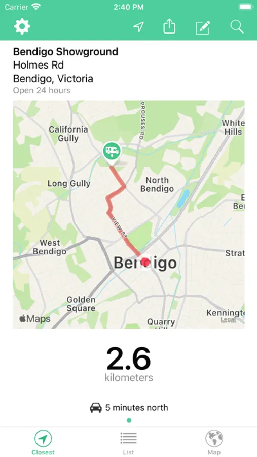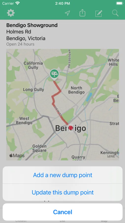 Find dump points nearby or search for a location anywhere in Australia, viewing an estimate of the distance, travel time and direction in a list or on a map. Show more information where available including the route, notes, payment requirements, key requirements, parking and a close-up map.