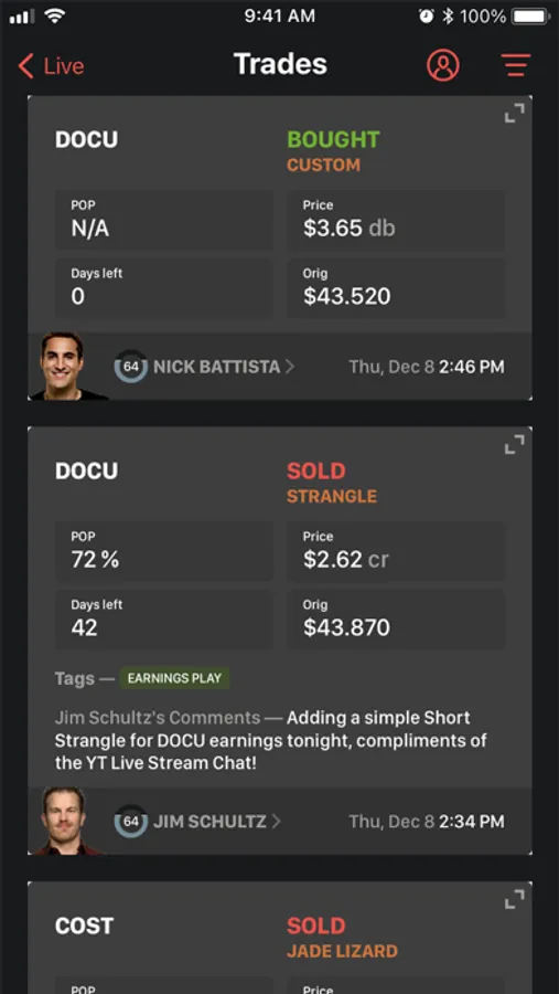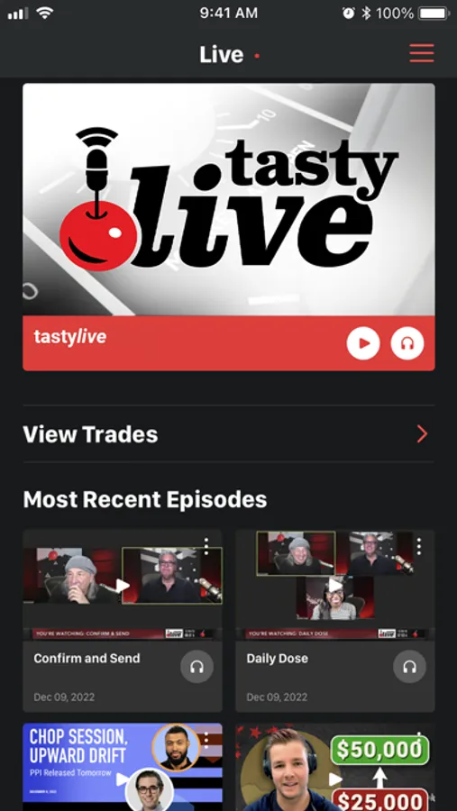 Learning new options and futures trading strategies and staying connected and engaged in the markets has never been easier with the tastylive app. With the tastylive app, you can catch the live show every day, as well as watch ALL of our available videos on demand 24/7. Not only that, but you can access our trade feed; follow and watch real traders trade real products in real time! What's the catch? There isn't one. We're free to use, no subscription necessary.