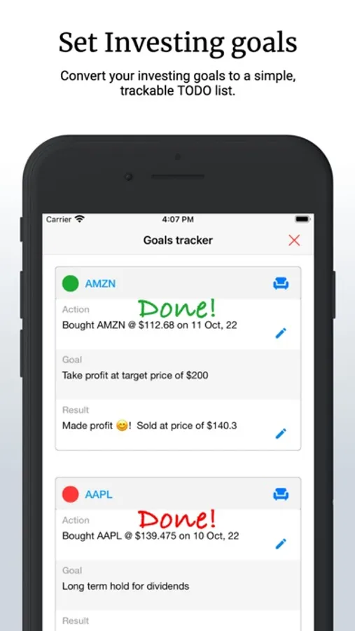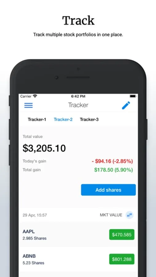 - Instant access to useful information on stocks you own: History of purchases, average cost price vs current market price, return on investment and percentage holdings.
