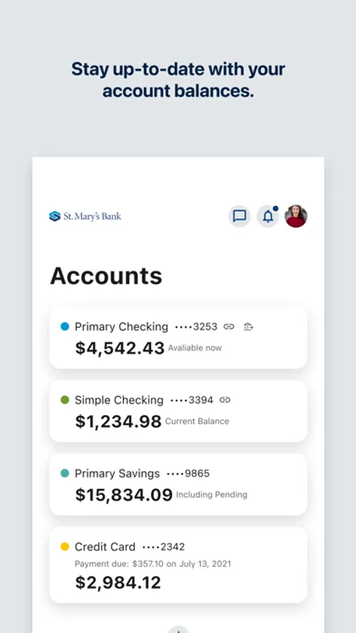 The St. Mary’s Bank Mobile Banking app gives you access to your accounts from your Apple mobile device. Check balances, review activity, pay bills, make transfers, deposit checks, log in with touch ID or facial recognition, get a snapshot view of your balances before login and more.