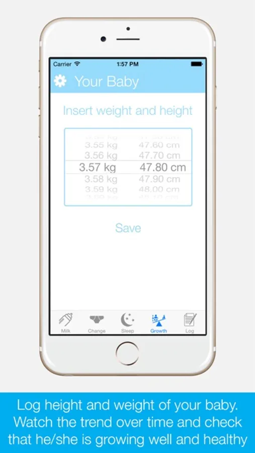 - Growth tab: record weight and height for your baby to see how well he/she is growing