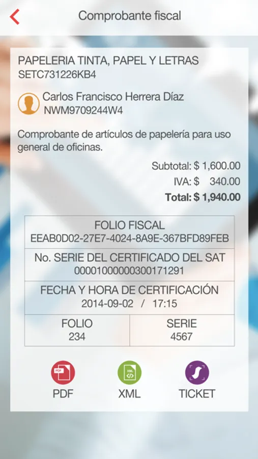 Con Ticket Factura podrás disponer de tu factura electrónica CFDI, consultarla cuantas veces quieras, además podrás enviar tu CFDI por correo electrónico a tu contador o a quien lo desees. Otra opción que te ofrece Ticket Factura es la posibilidad de ver el PDF de tu factura electrónica.