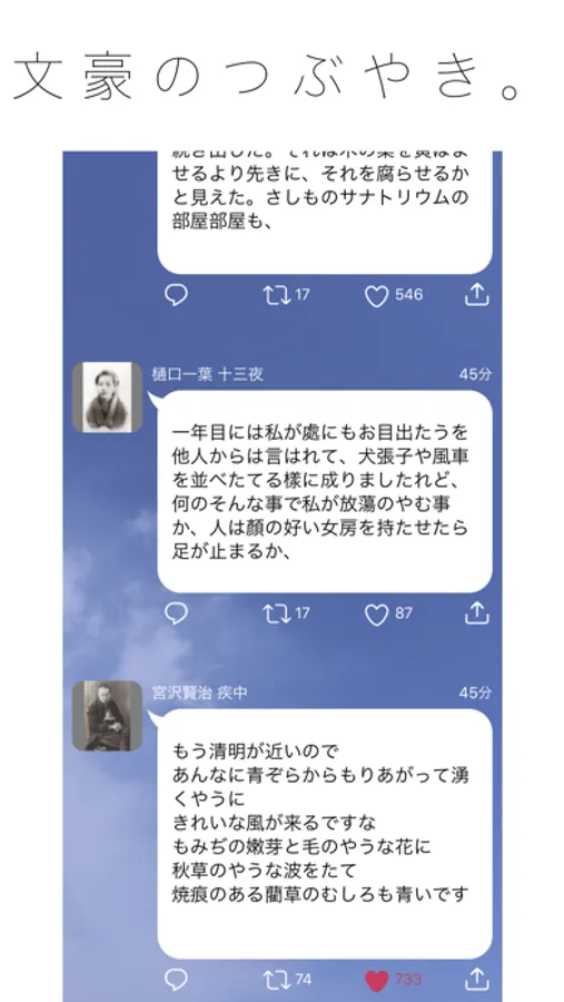 ◆ 160 literary giants tweet their own works in their entirety on an irregular basis.