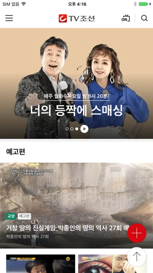 1. 홈 화면: TV조선에서 추천하는 다양한 프로그램 정보와 예고편, 인기 VOD까지 한눈에 확인하실 수 있습니다. 플로팅 배너를 통해 온에어, 편성표, 온에어 플러스 페이지를 쉽게 이동하실 수 있습니다.
