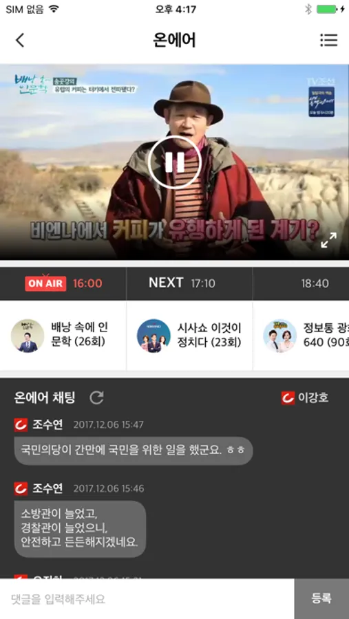 2. 온에어: TV조선에서 방영중인 프로그램을 실시간으로 플레이 하실 수 있으며, 온에어 채팅을 통해 실시간으로 의견을 남길 수 있습니다.