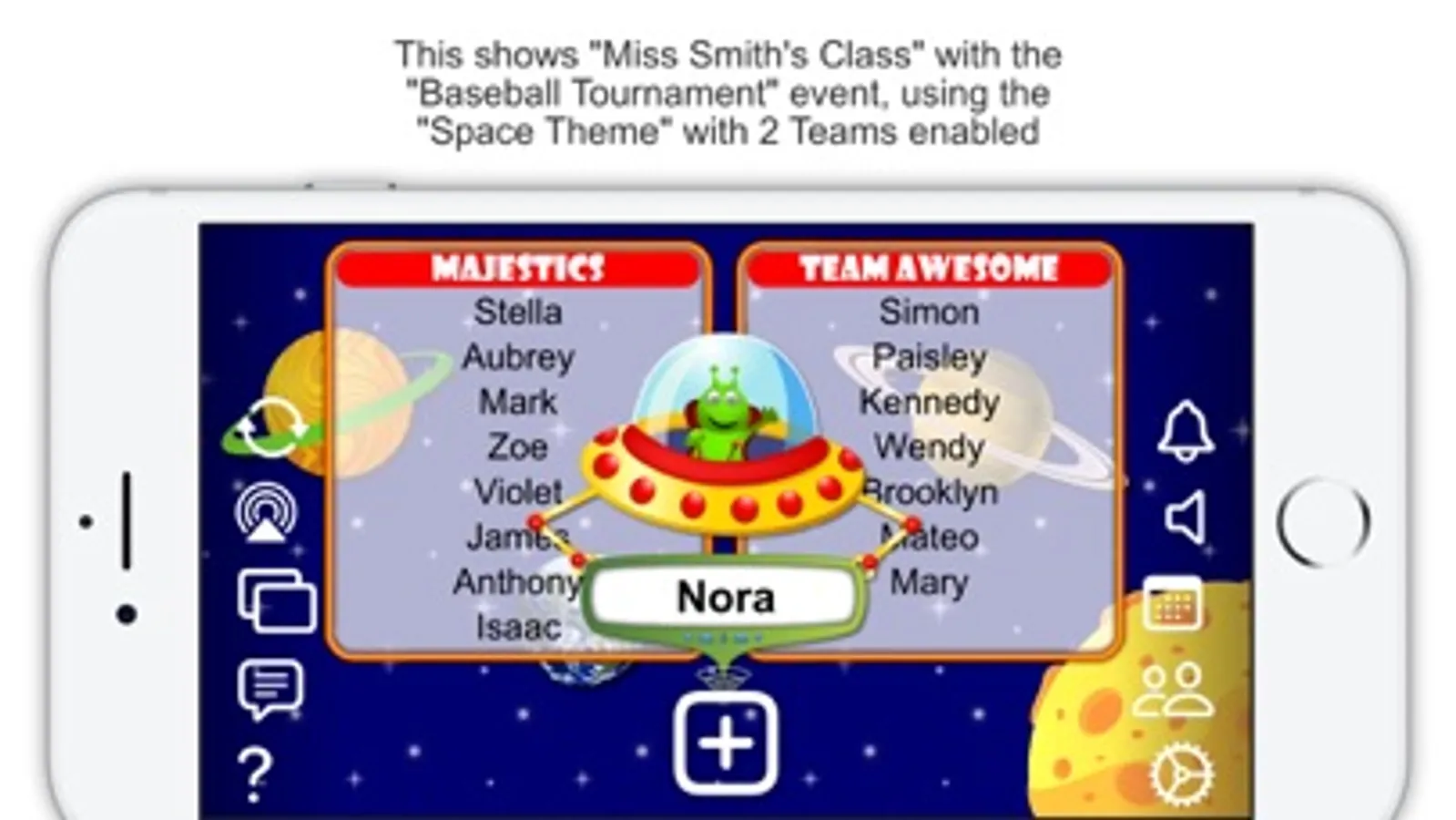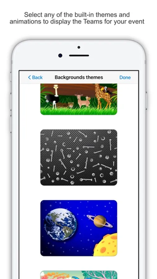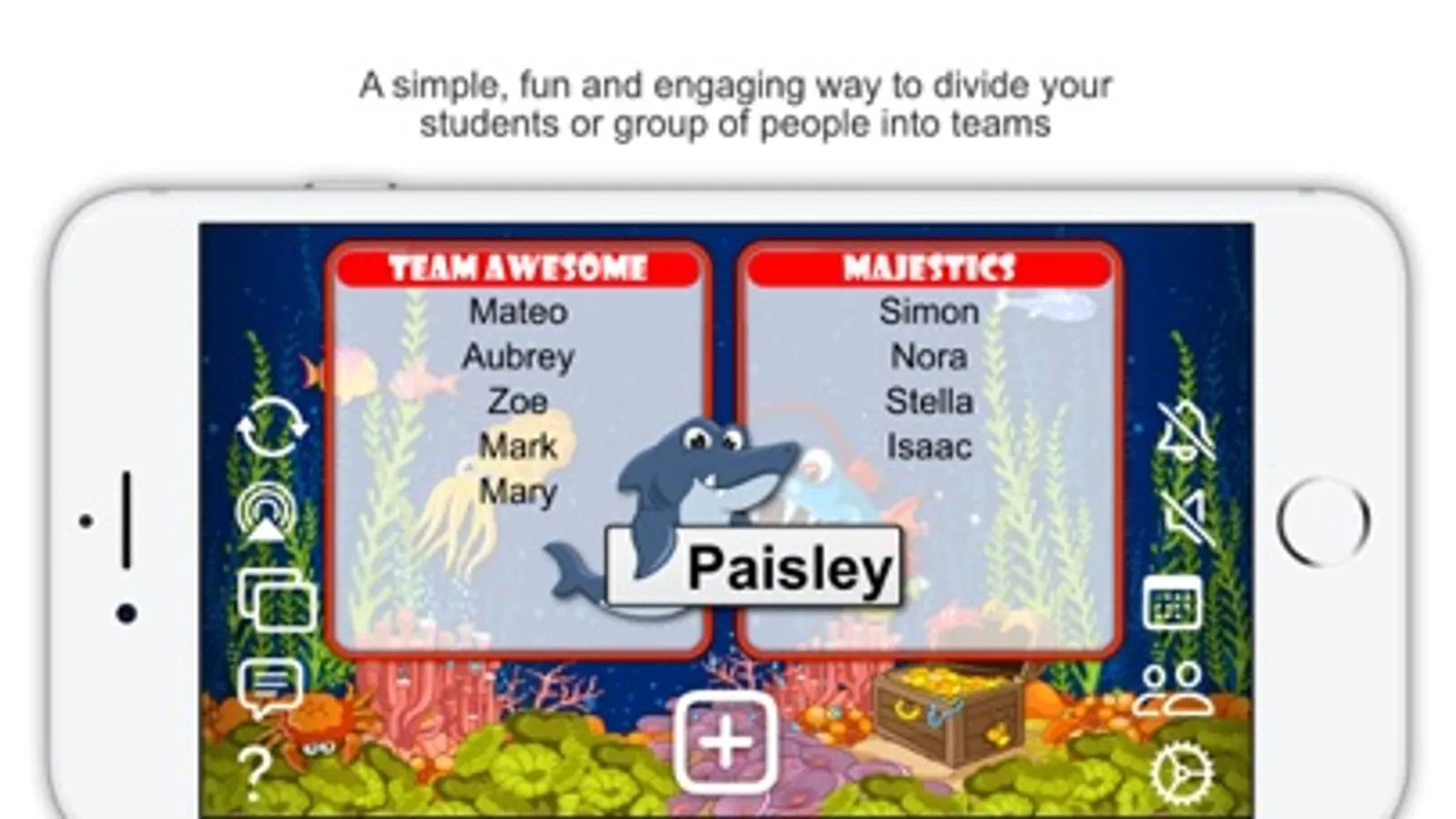 Simply create a class group, enter the names of your students, select how many teams you want to divide them into (you can select up to 8 teams) and then choose from one of the built-in themes...Jungle, Dino, Metal, Underwater and Space (with more to come). Each theme has it's own animations and sound effects to keep the app fresh and exciting for students.