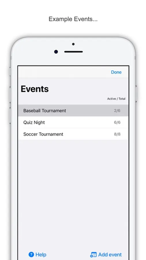 You will create your own of course but to get you started, the app is pre-populated with example Groups, Events and Teams.