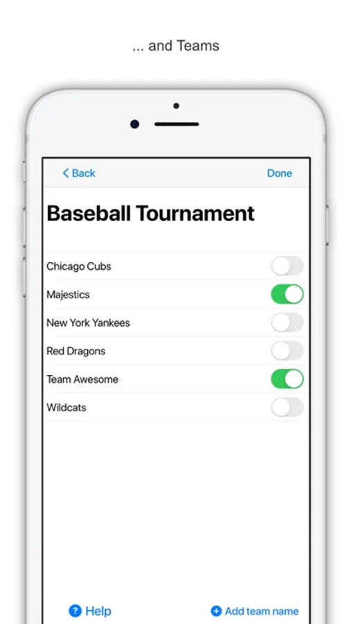Once an Event (e.g. Baseball Tournament), and a Group (e.g. Miss Smith's Class) are selected, the user selects the required Theme from the five "Themes" in the app, and then goes to the main screen of the app where the names in "Miss Smith's Class are randomly distributed into the "Teams" contained in the Baseball Tournament (Event).