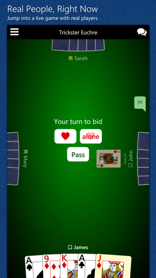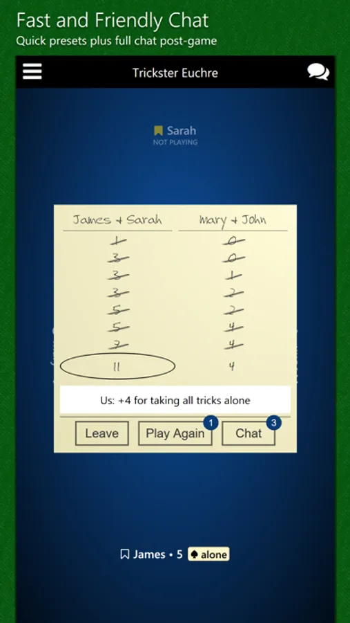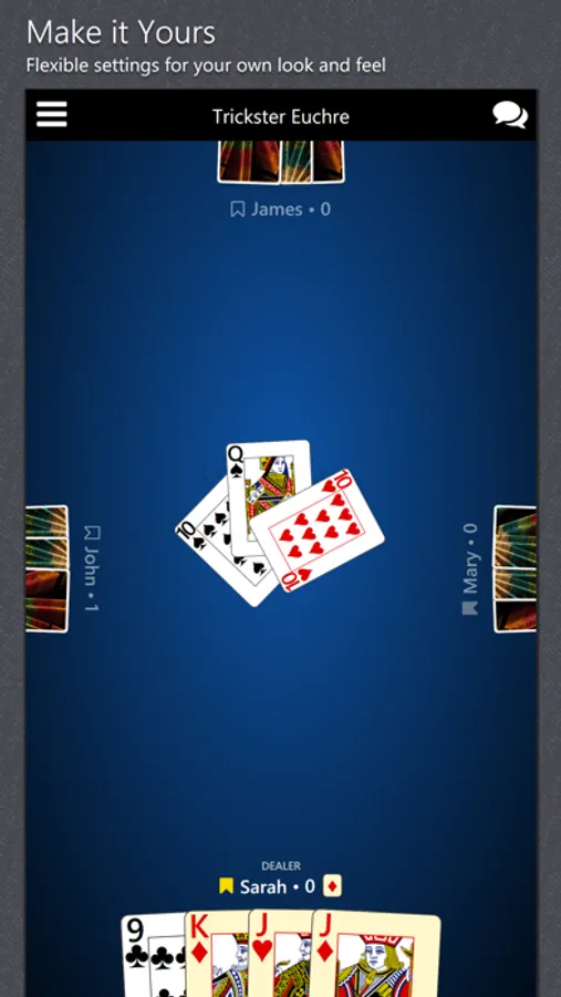 Select “Play” and Trickster Euchre finds other players based on skill and speed. Get started without waiting — other players join as they’re ready. After the game, “Play Again” keeps you playing with the same group.