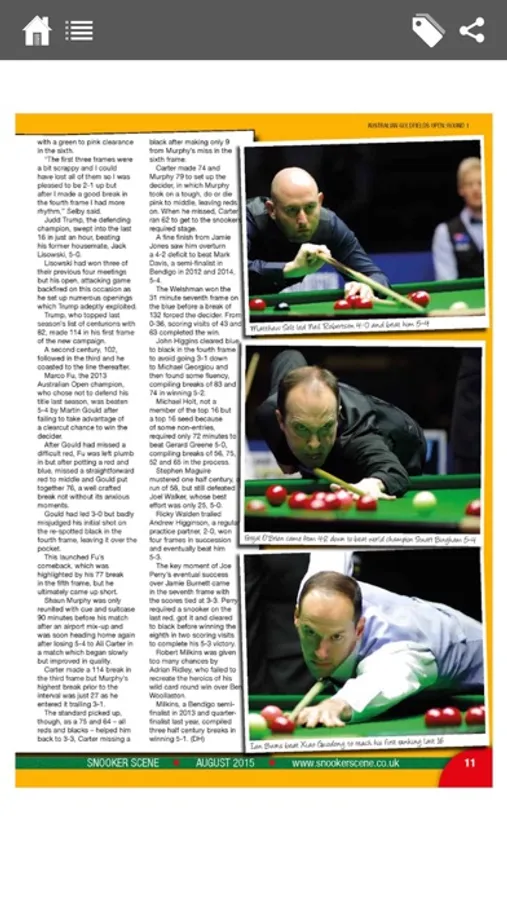 Snooker Scene which was founded in 1971, is by far the games longest running and most influential magazine. We report all significant action on and off the table in the worlds of snooker and billiards and also have a section on international pool. Our bedrock is our worldwide tournament coverage, supplemented by stories and features about players and other personalities within the snooker world.