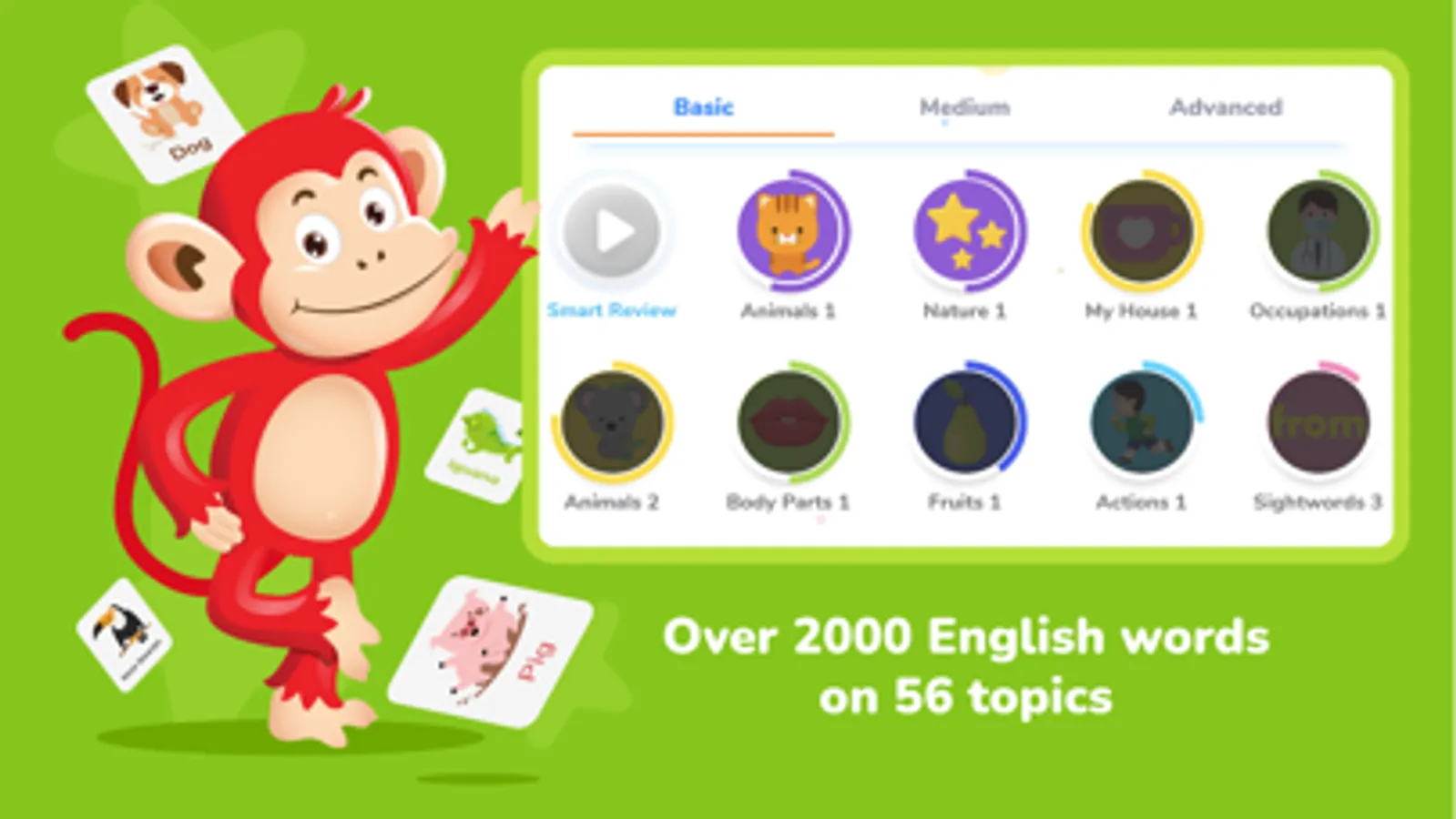 Over 2,000 English words for children at three levels from Basic to Advanced, covering 56 familiar topics.