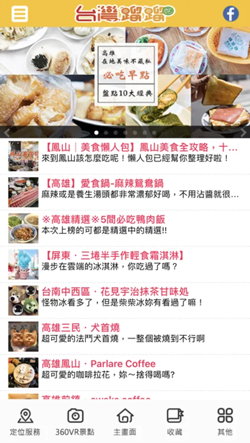全台分為五大區:北、中、南、東、離島,台灣蹓蹓細心整理出全台的旅遊行程供您參考,當中指定的行程景點包含了720度VR實景,讓您人還沒到就可以先看看景點的美景,再推薦各景點週邊的美食、住宿等資訊,提供您旅程中的相關資訊,您也能針對每個行程提出建議及評分,讓內容更加豐富。