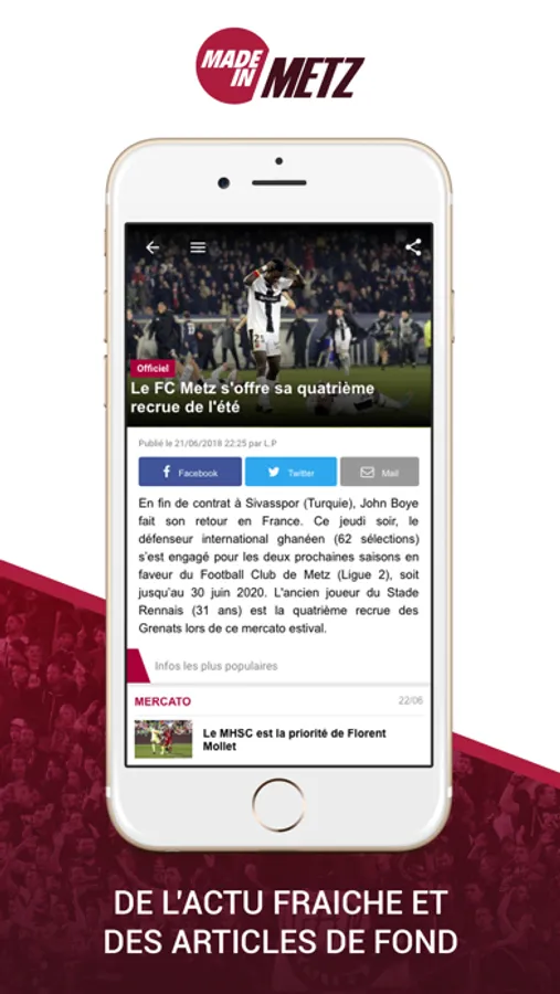 Suivez toute l'info des Grenats gratuitement sur votre mobile, grâce à l'application Foot Metz (Infos, Analyses, Interviews, Mercato, Résumés de matchs).