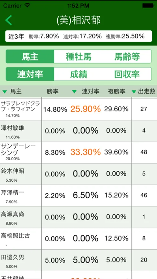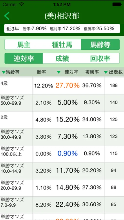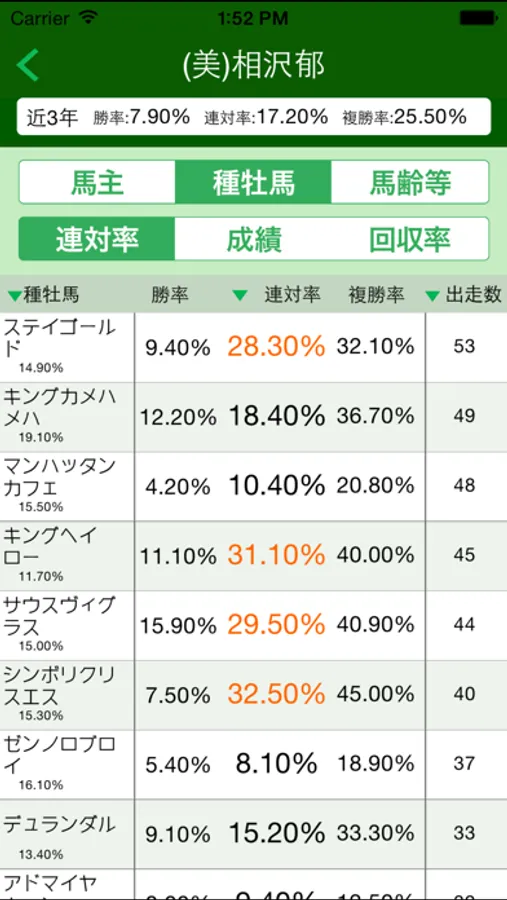 騎乗数20以上で、連対率40%以上を赤、25%以上をオレンジ、5%未満を青で表示しているので、騎手と厩舎の相性がとてもわかりやすい!