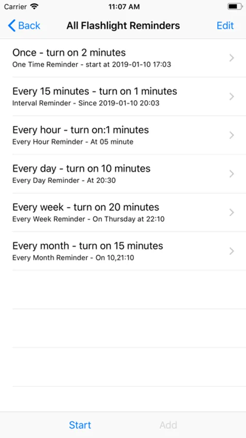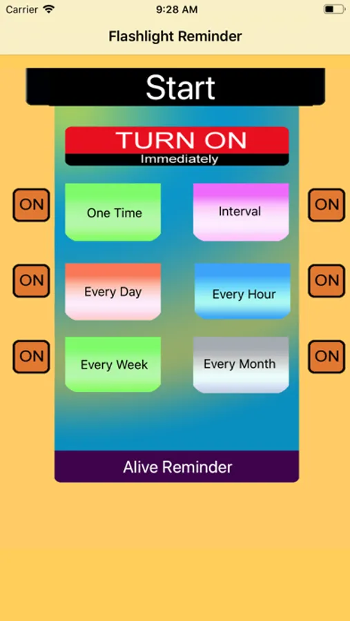 1.Turn on the flashlight by One time reminder. 2 turn on the flashlight by interval reminder. 3 Turn on the flashlight by every hour reminder. 4 Turn on the flashlight by every day reminder 5. Turn on the flashlight by every week reminder. 6 Turn on the flashlight by every month reminder. 7 Turn off the flashlight after the indicted duration.