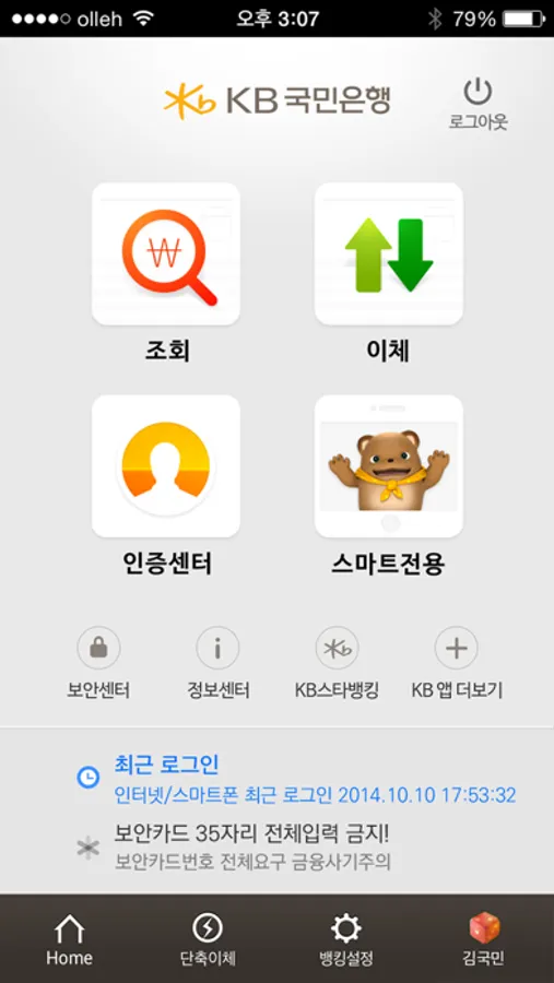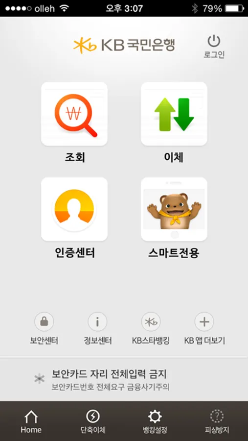 - 안전한 금융거래를 위해 탈옥 등 운영체제가 변조된 경우 서비스 이용이 제한됩니다.