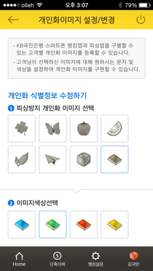 KB스타뱅킹미니 어느 화면에서나 확인할 수 있는 나만의 문구와 이미지인 『피싱방지이미지』설정을 통해 보다 안전하게 이용해보세요. 뿐만 아니라『이용폰지정』, 『보안SMS서비스』, 『신입금계좌지정서비스』 등 다양한 보안서비스를 확인하실 수 있습니다.