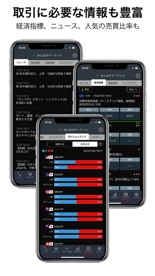通貨強弱・ヒートマップがあらたに追加され、今、マーケットでは、どの通貨が買われているのか(売られているのか)を確認できるようになりました。その他にもニュース、経済指標、売買比率、価格分布と豊富に取り揃えており、為替ニュースをもとに、AIで1時間後の買と売を予測するTMサインも用意しております。