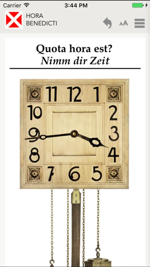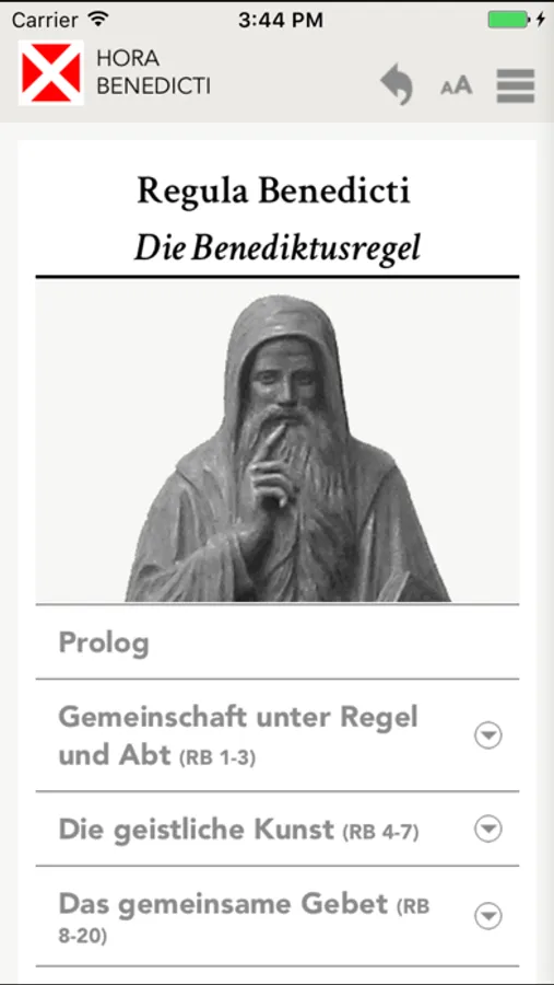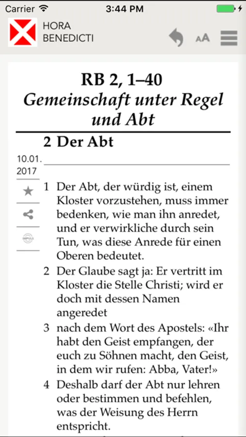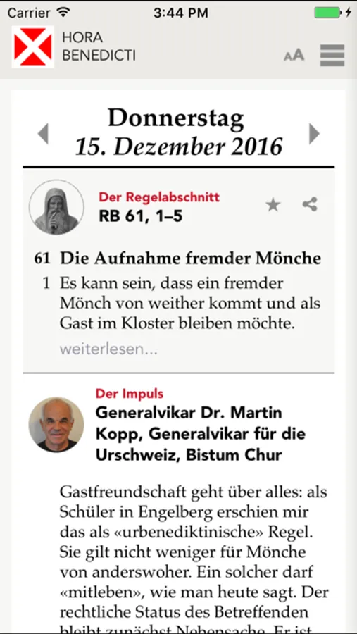 HORA BENEDICITI bringt diese Abschnitte zusammen mit den jeweiligen Inputs tagesaktuell als App auf ihr Mobilephone. Der tagesaktuelle Abschnitt kann auf dem Sperrbildschirm angezeigt werden. In der App lässt sich eine Übersicht über die ganze Regula-Bendicti gewinnen sowie Lieblings-Abschnitte als Favoriten markieren und mit Freunden teilen. Die App verzichtet auf Töne und lässt sich selbst im Flugzeug-Modus nutzen. Auf diese Weise kann sie jederzeit und allerorts als Ausganspunkt für eigene Gedanken dienen kann. Aktualisierungen der App erfolgen im Online-Modus des Mobilephones.