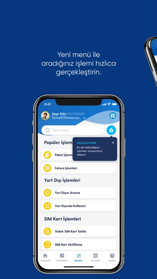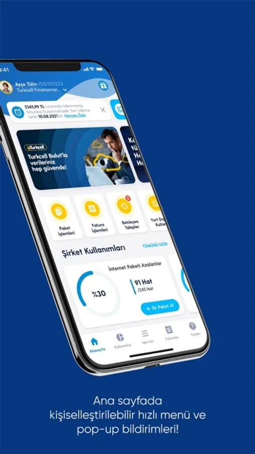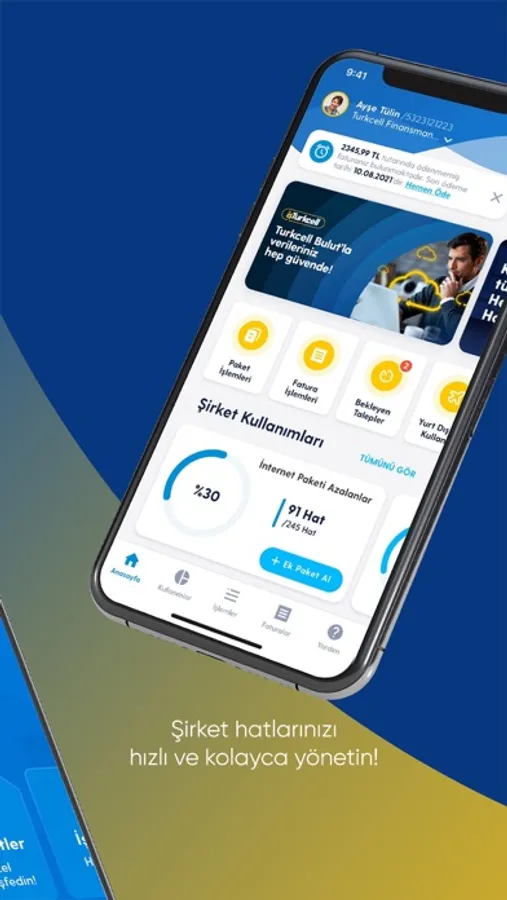 İşTurkcell Online uygulamasını kullanarak şirket hatlarınız ile ilgili işlemleri kolayca yapabilirsiniz. Tüm hatlarınızın paket bilgilerini kontrol edebilir, paketi bitmek üzere olan hatlarınıza ek paket tanımlayabilirsiniz. Faturalarınız kesildiğinde beklemeden görüntüleyebilir tek tek ya da tüm faturalarınızı tek seferde ödeyebilirsiniz. Hatlarınızın yurt dışı, internet gibi ayarlarını değiştirebilir, şirket çalışanlarının taleplerini onaylayabilirsiniz. Şirket hatlarınızla ilgili daha birçok işlemi saniyeler içerisinde İşTurkcell Online uygulamasından yapabilirsiniz.