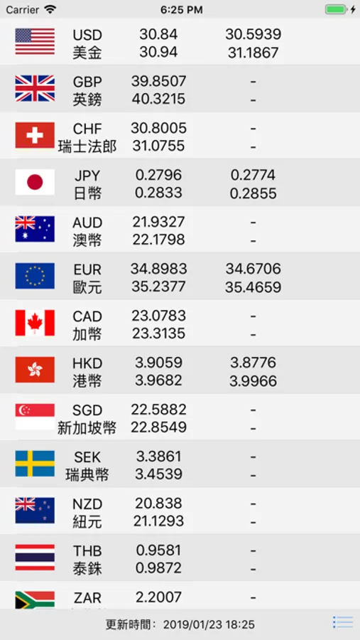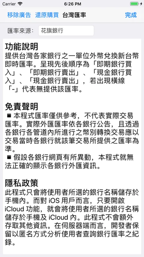 提供台灣各家銀行之一單位外幣兌換新台幣即時匯率。呈現先後順序為「即期匯率」、「現金匯率」,而上欄為「銀行買入」下為「銀行賣出」,若出現橫線「-」代表無提供該匯率。在程式顯示匯率區域下拉可以立即重新整理匯率。