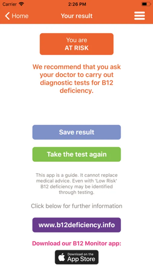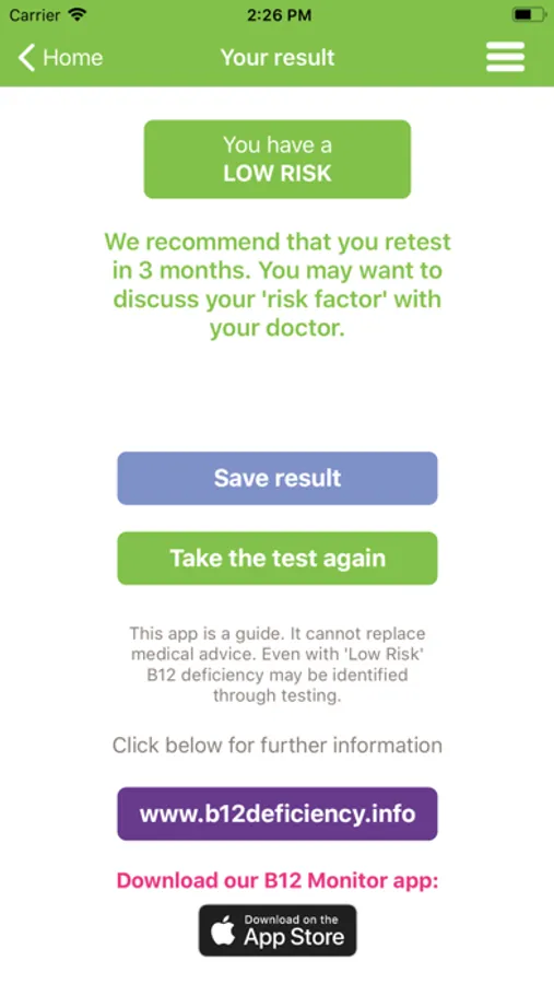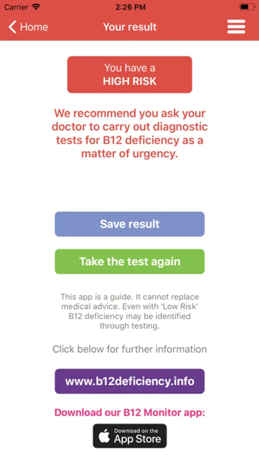 Please Note: A HIGH risk will require further investigation and the app will forward you to further help and information on ‘What to do Next’ please TRY NOT to supplement with B12 before medical testing is carried out as this can skew your blood results and you may remain undiagnosed.