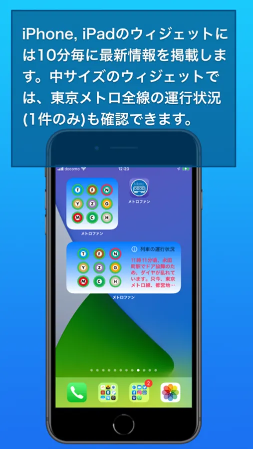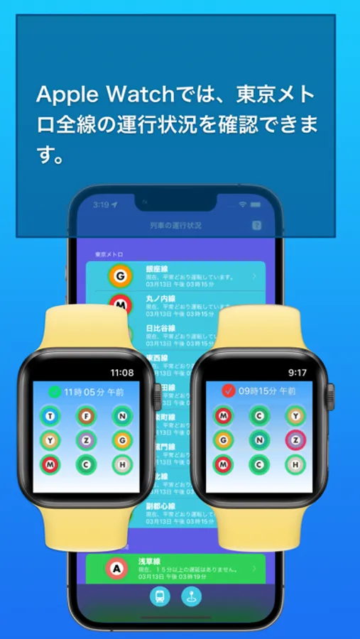 アプリでは、東京メトロ、都営地下鉄、横浜市営地下鉄 各鉄道全線と、東京さくらトラム、日暮里・舎人ライナー、ウィジェットとアップルウォッチでは東京メトロ全線の運行状況をスマートにお知らせします。