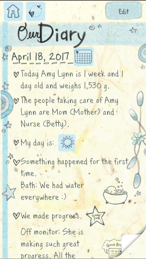 “My preemie app is the best tool to jot down all the little milestones that happen. ... then at the end of the day I send my diary by email through the app to the grandparents to know all about their new grandson’s progress. Highly recommend this app!”