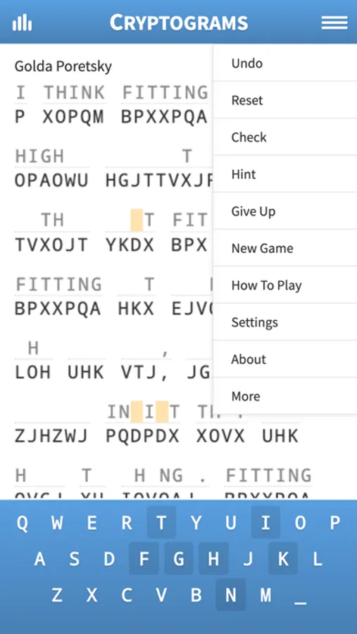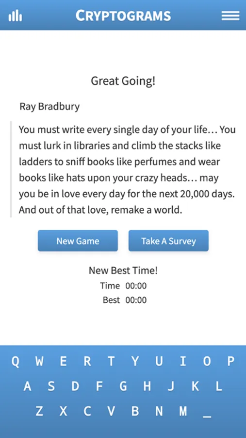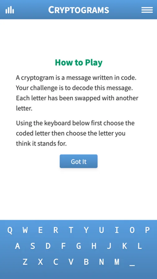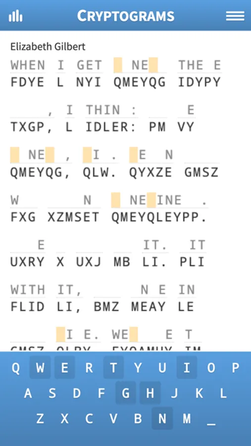 A cryptogram is an encoded statement that requires a degree of strategy to decode. The cryptograms found in this puzzle game use a 1-to-1 substitution cipher. For example all of the letter N’s in a cryptogram might stand for the letter B in the decoded statement. Aside from letters nothing else in the statement has been changed, e.g. spacing and punctuation. In the case of this puzzle game all statements are quotes from relatively famous to very famous individuals. Using your knowledge of the English language and grammar, see if you can decode the quote!