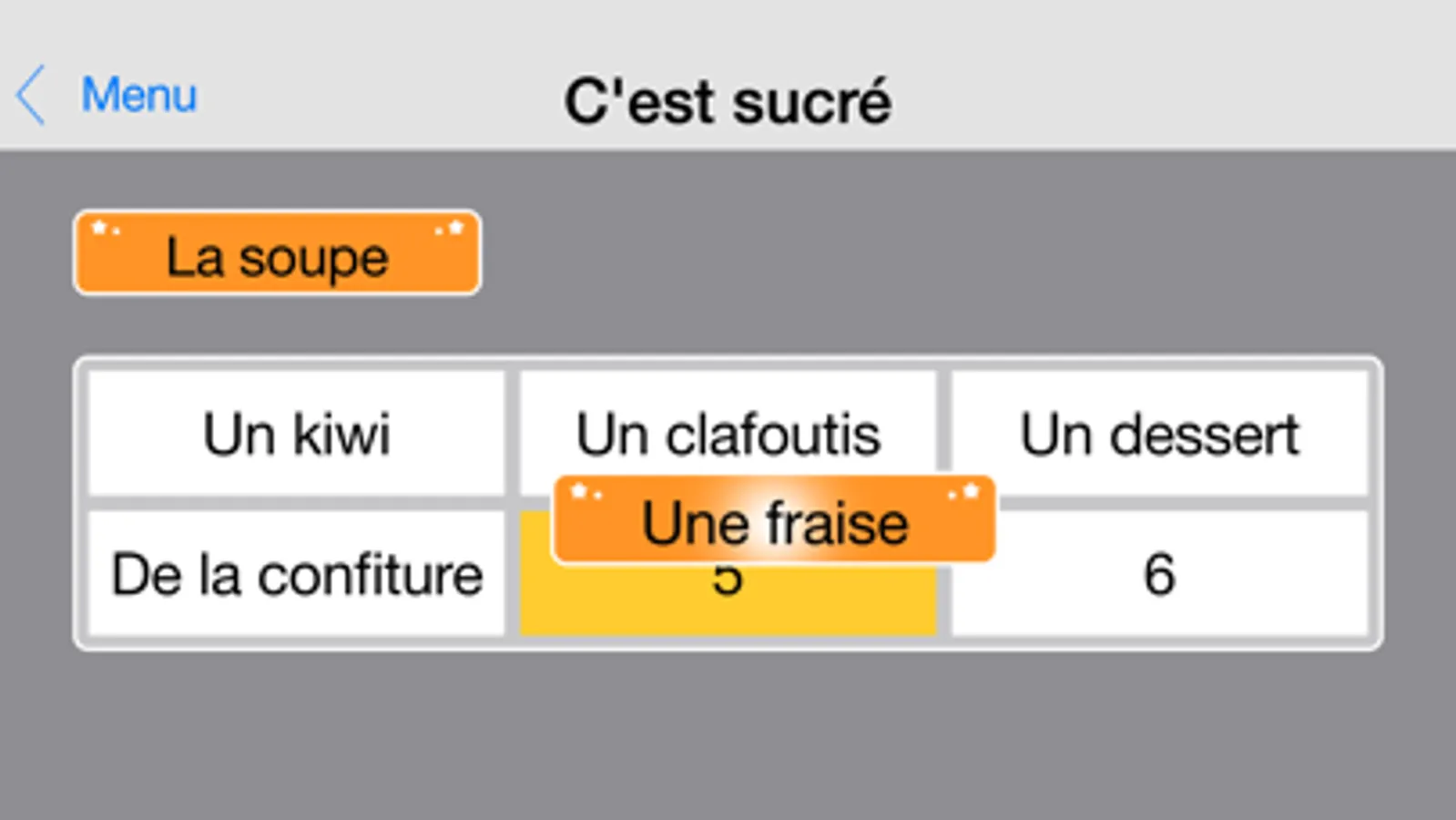 Une paire de mots s’affiche. Celui qui correspond au thème (les sports, l’eau, les métiers…) doit être placé dans la « boîte à mots » qui contient six cases.