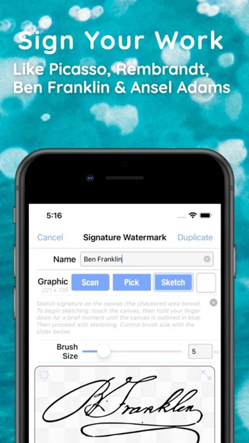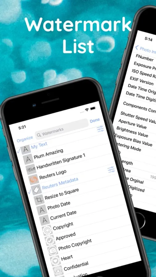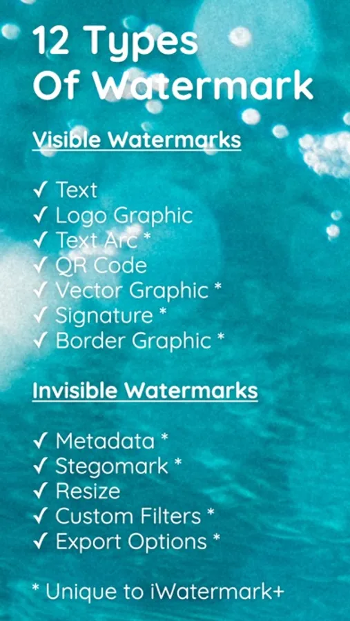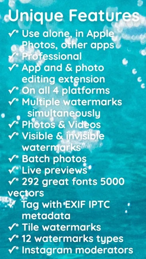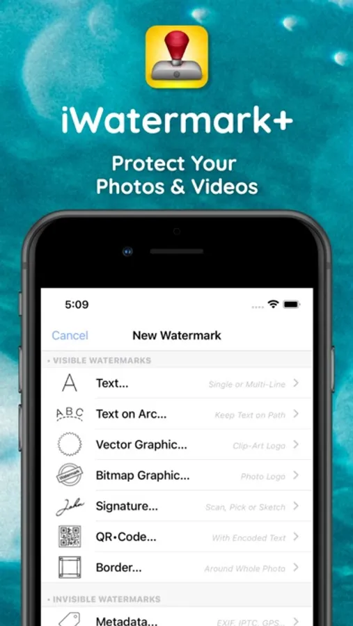 Watermark photos or video. Pro level watermarking with visible or invisible watermarks. Custom watermark with logo, text, metadata tags, QR codes, borders, vectors, metadata, steganographic, lines and signature watermarks. Batch watermark photos. Use 1 watermark or many watermarks simultaneously. The best present you can buy for an iPhonographer