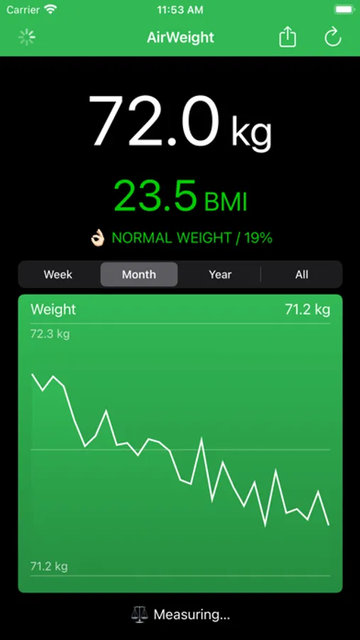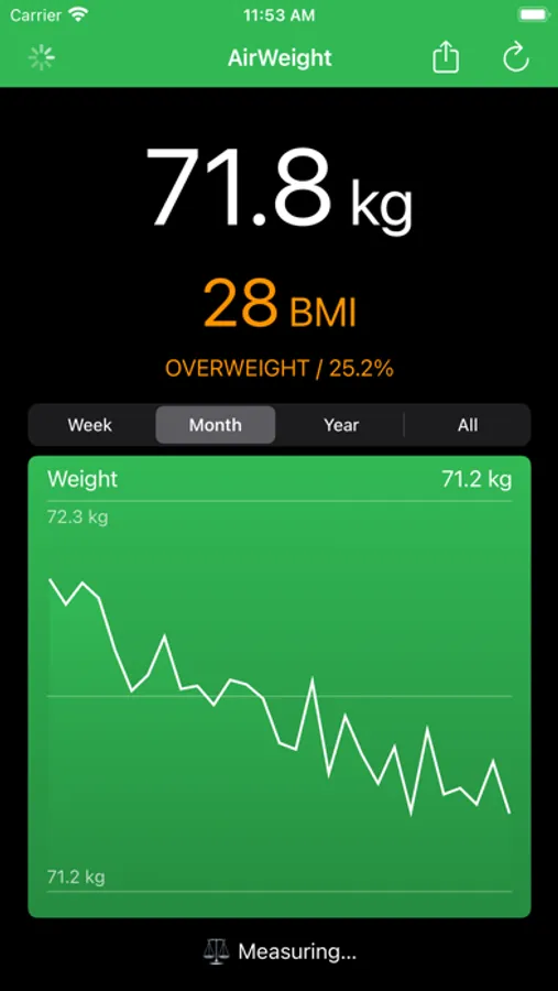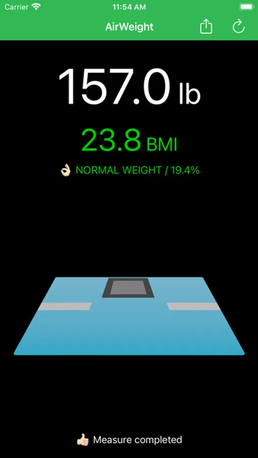AirWeight connects to your Xiaomi Mi Scale or SANITAS SBF70 Bluetooth scale and reads your weight in realtime, computes your body mass index and body fat percentage and saves the measurements in the Health app.