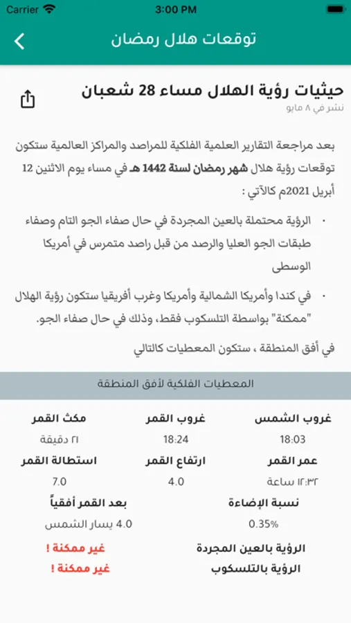 مع التطبيق ستتمكن من الاطلاع على تفاصيل رؤية الهلال وتوقعات الهلال ومشاركتها عبر وسائل التواصل المختلفة. كما يحتوى التطبيق على قسم خاص لأخبار وبيانات المجلس وصور لفعاليات الاستهلال