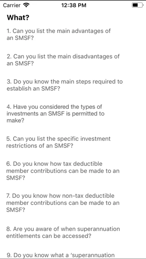 The app walks through a number of the core issues likely to be relevant in relation to whether an SMSF is likely to be of potential benefit, and depending on the answers provided, generates a free white paper that provides general information in relation to some of the issues that may be relevant, given the answers provided.