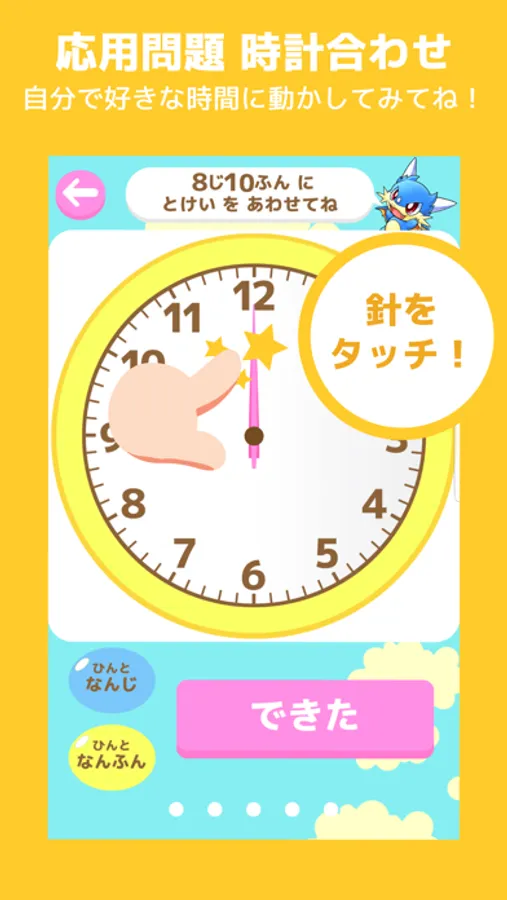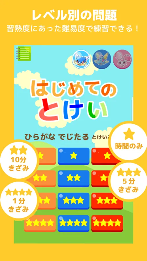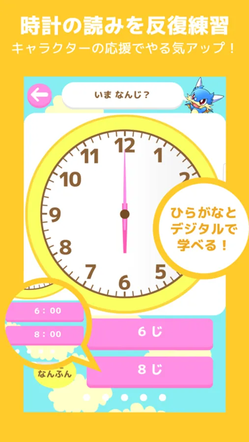 時計の読みを楽しく学べるアプリです。ひらがな・デジタル・時計合わせの3種類を時間と分を段階的にトレーニングできます。