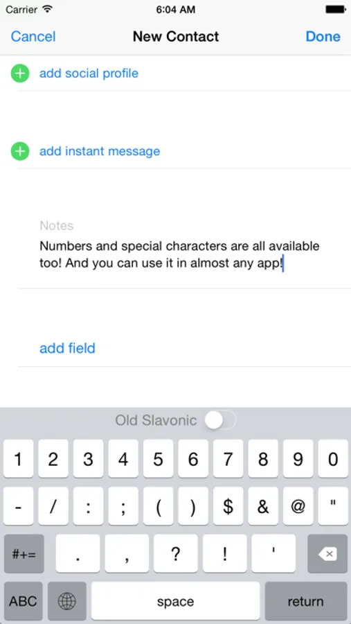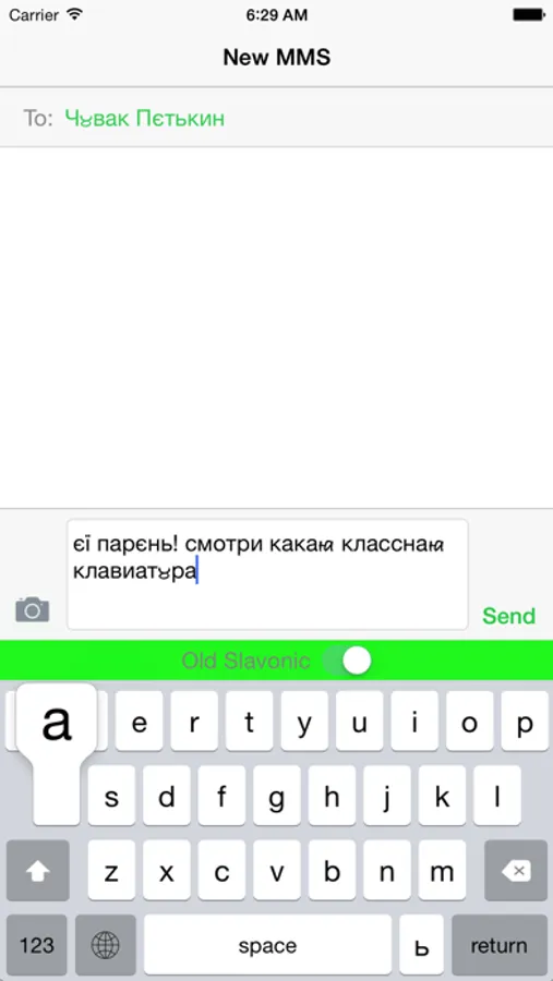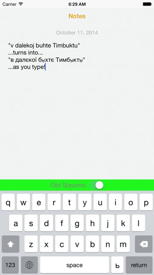 Translit Keyboard lets you use your normal English QWERTY keyboard to type letters in another alphabet — a technique known as "transliteration". For example, with the Old Slavonic keyboard, you can type a word like "ponchik" and see it transform into "пончик" right as you type. You don't have to wait or press any buttons: just type it out like it sounds!