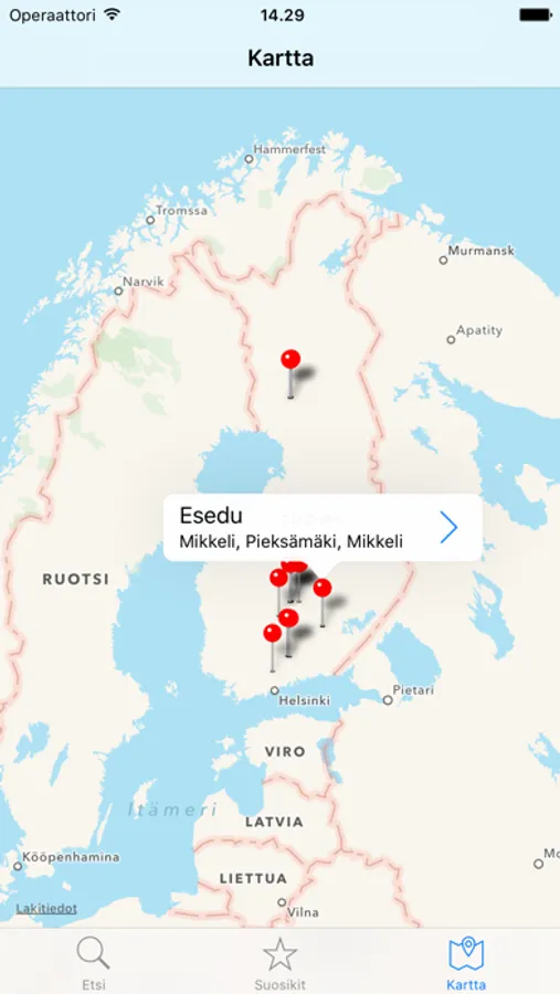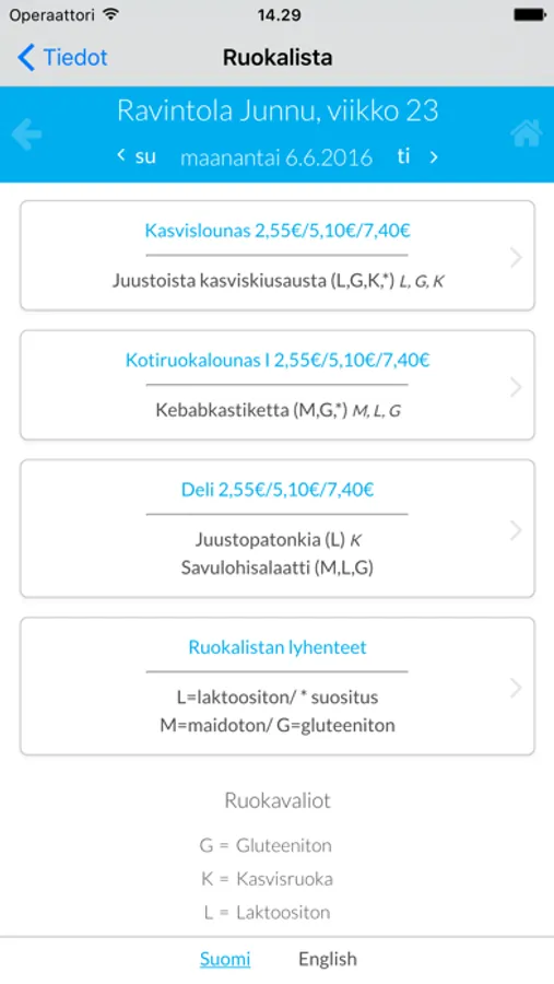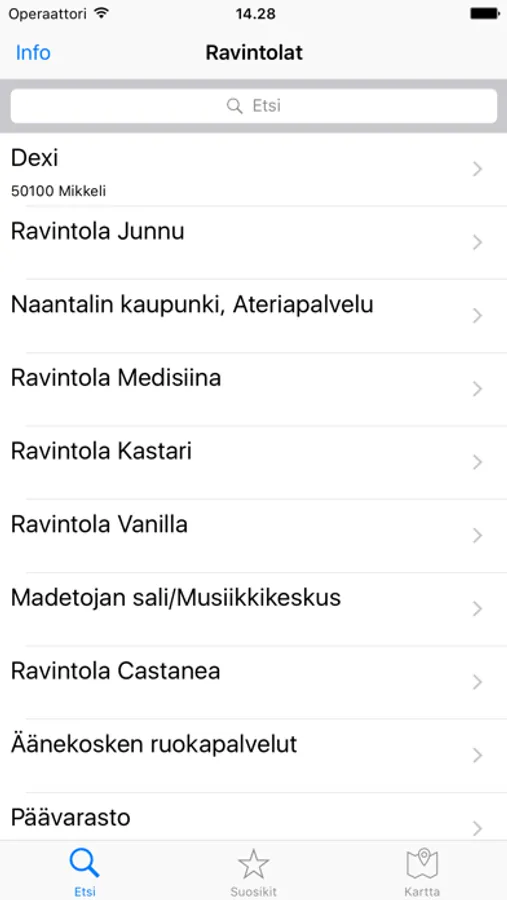 JAMIX MENU -sovellusta käyttäviä ravintoloita voit hakea kätevästi joko listalta tai kartalta. Karttanäkymään avautuu lähialuekartta, jonka kautta voit suoraan siirtyä tarkastelemaan valitsemasi ravintolan ruokalistaa. Sovellus avautuu suosikkinäkymään, jonne voit rakentaa oman suosikkilistasi valitsemiesi ravintoloiden ruokalistoista.