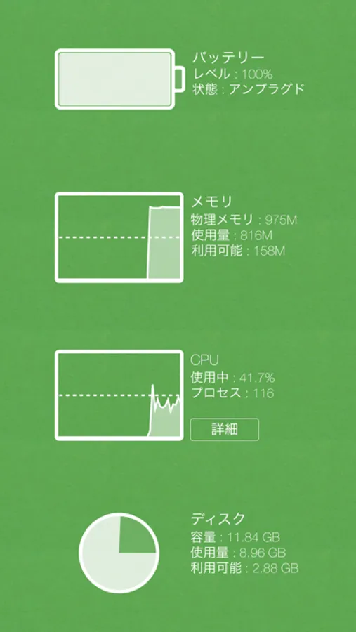 You can use it view your iDevice's battery, memory, CPU processes and disk space status quickly.