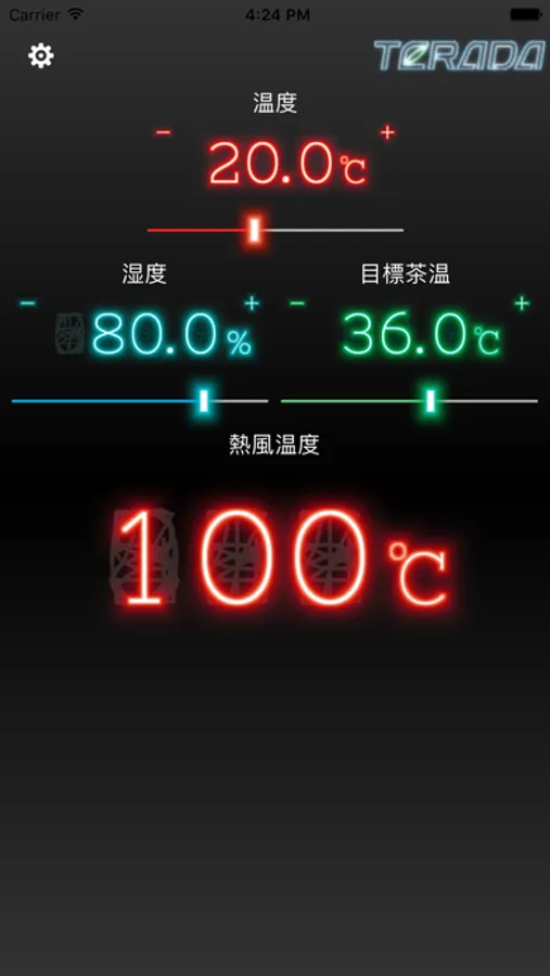 ・温度、湿度、目標とする茶温を設定します。設定値が変わるごとに最適な熱風温度が計算、表示されます。