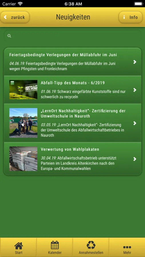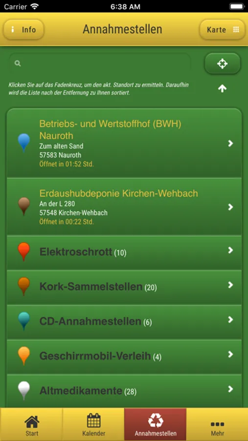 * Annahmestellen für Abfälle aller Art mit Ortsangabe und Öffnungszeiten, inkl. Kartenansicht und Navigation.