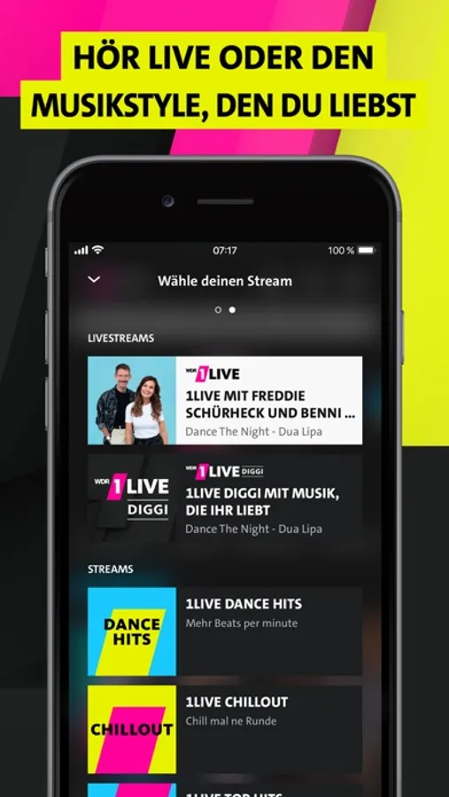 Stream your favorite radio stations 1LIVE and 1LIVE DIGGI live. With our playlist including cover display you will always have an overview of the most recently played songs. For even more music simply listen to our other streams. The app gives you direct access to "Dance Hits", "Top Hits", "Hip Hop & R'n'B", "Rock Hits", a "Chillout" stream and the "Mix of the Week", a specially curated selection of music on regularly changing themes.