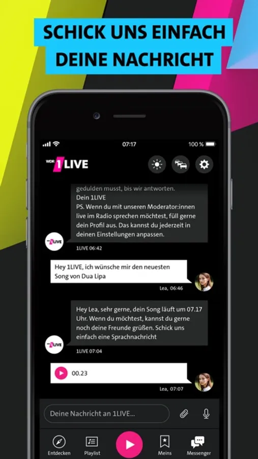 Our messenger is your direct line to 1LIVE. Send us text or voice messages, photos or videos, or call us directly and help shape our programming. Tell us what's going on and we'll pass it on! Take part in our competitions or make a request for your favorite song.