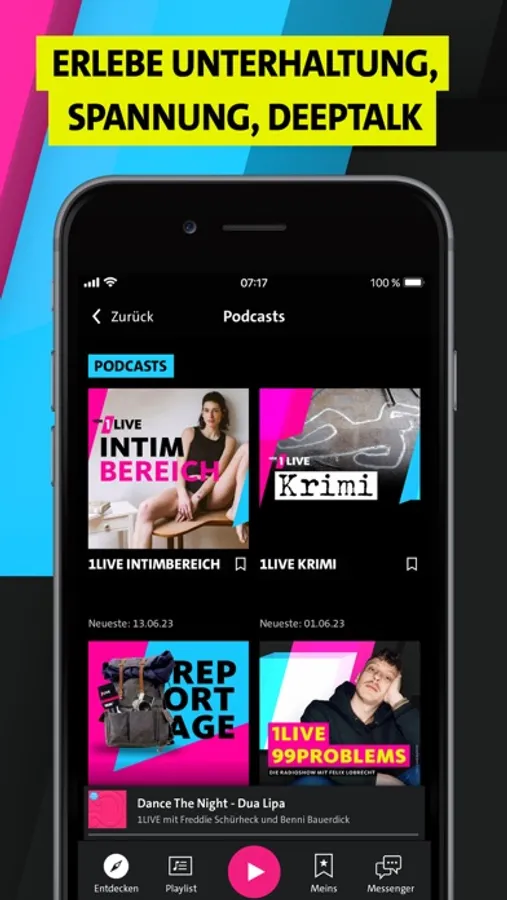 - Experience entertainment, excitement and deeptalk with our podcast: Subscribe to your favorite series and get notified when there's a new episode of "Intimbereich" or "99 Problems mit Felix Lobrecht," for example.