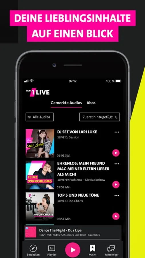Subscribe to your favourite shows now and never again miss the “O-Ton-Charts”, an episode of our comedy highlights "Dennis ruft an" or the latest edition of the "1LIVE DJ Session". Our podcasts are also available on demand at any time. Enjoy your individual 1LIVE programme in the "MEINS" section whenever you want - even offline and without an internet connection.