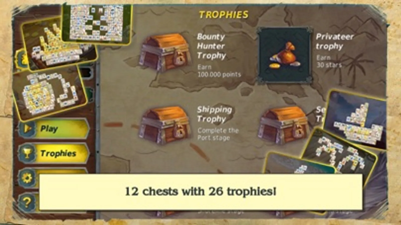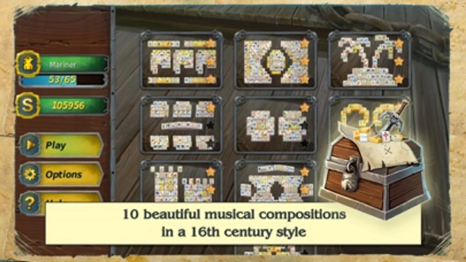 Set sail from Port Royal on a ship called the Golden Hind and head for Hard Luck Island. Legend has it that untold treasures are hidden there. The treasure trove's location is encoded in special tiles which you have to remove to reach the gold! To reach the prized hoard, you must complete 6 stages of varying difficulty: you'll encounter themed, grandiose levels with 300 tiles, high levels with 15 layers and levels made entirely of gold! The greed and generosity of pirates knew no bounds. The smuggler's path wasn't easy – point goals and limited moves will present a serious challenge to your abilities.