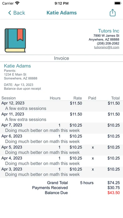Send professional invoices, schedule tutor sessions, and stay in touch with tutor students all from your iPhone or iPad. Tutor Tracker was built by tutors for tutors like you! We built an app that understands how tutors need to invoice and communicate with their students. You can organize students into groups and invoice them. If a student is running late, tap the student and give them a phone call or send a text, all from within the app.