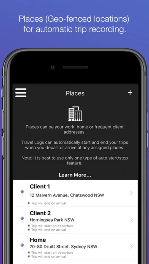 This app complies with the Australian Tax Office (ATO) logbook format. It will calculate the percentage of business use for each vehicle and total business distance in the exported log reports.