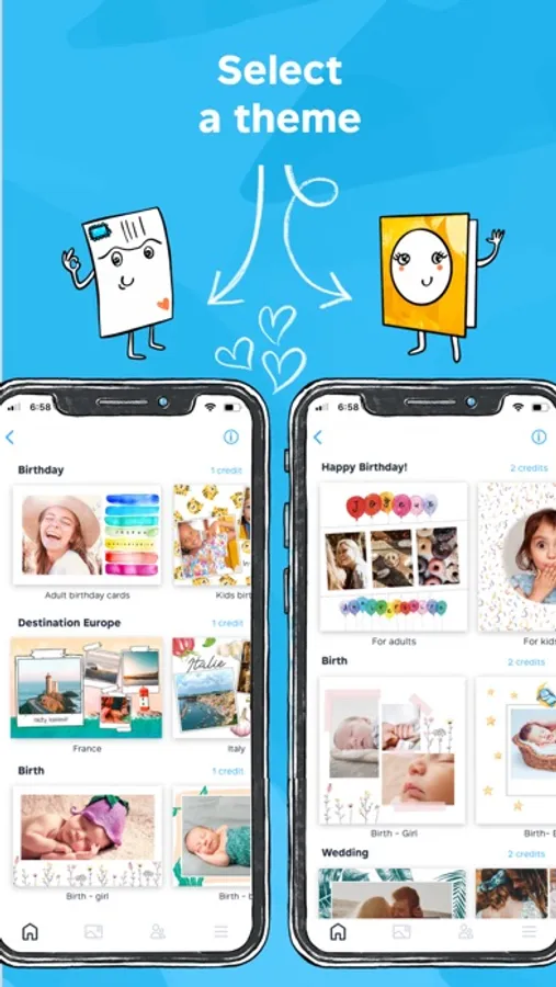 Personalize your cards and albums with your own photos. Write a message, add stickers and emojis, validate...and it’s sent in an envelope! Discover new designs made by our two illustrators all around the year.