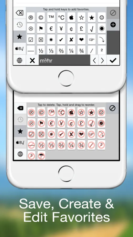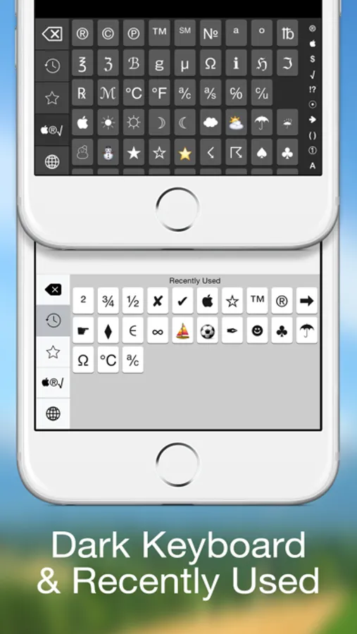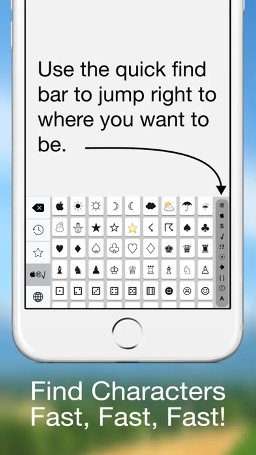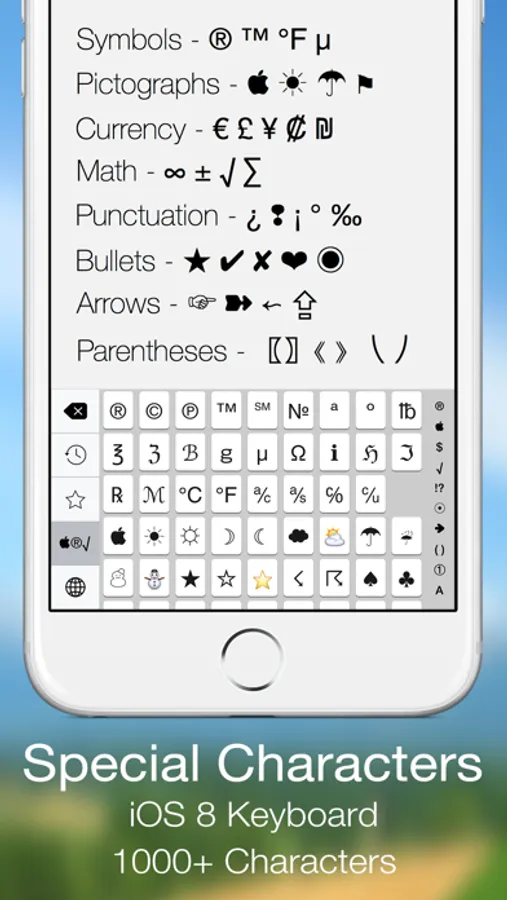 Special Characters is an iOS 8 keyboard that gives you access to all the symbols, glyphs, bullets, arrows and other special characters that you can't access from the standard iOS keyboard.