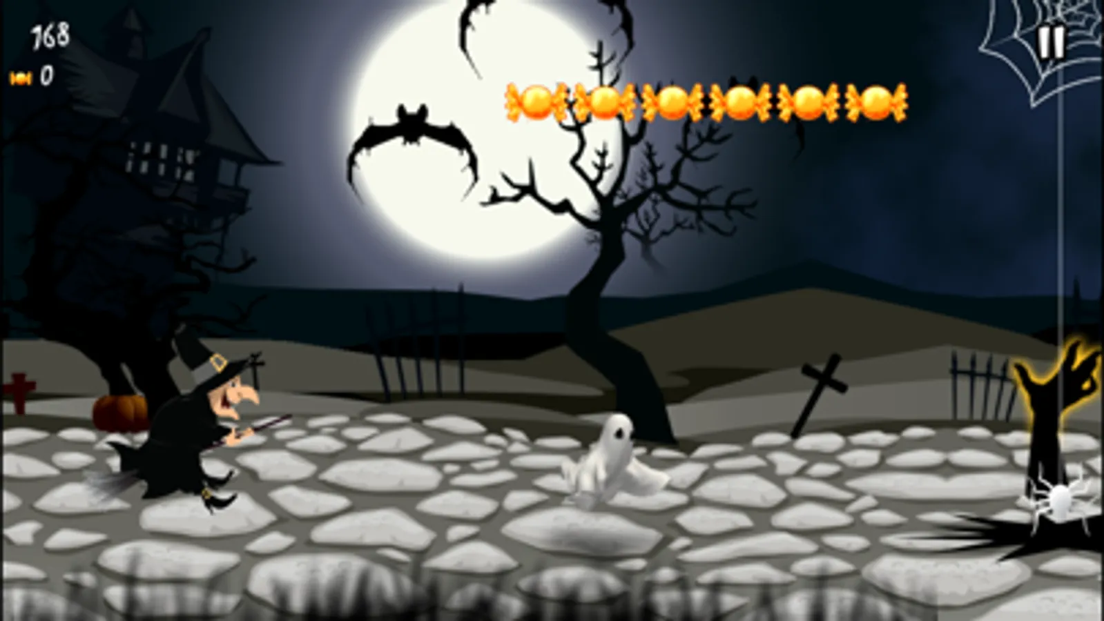Use the magic broom to avoid lightnings, grave hands and flying pumpkins.